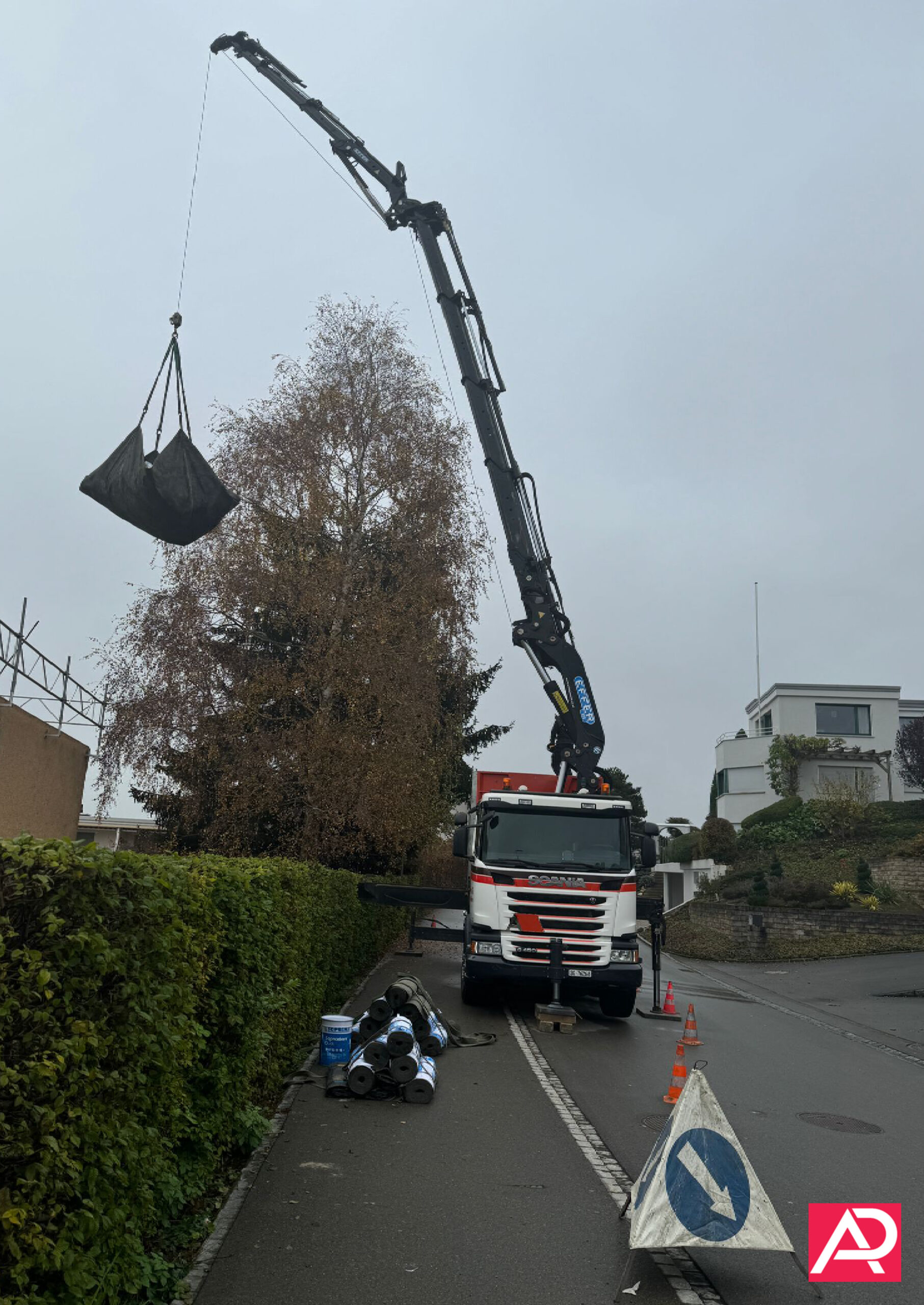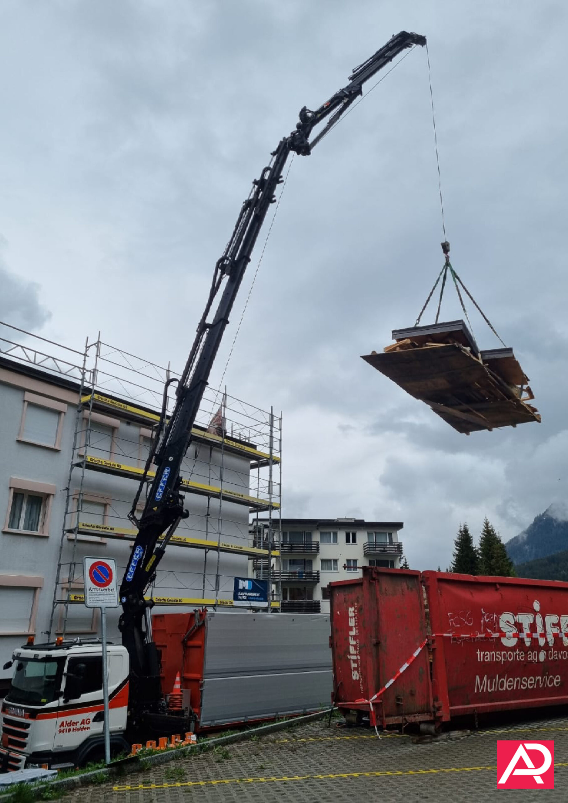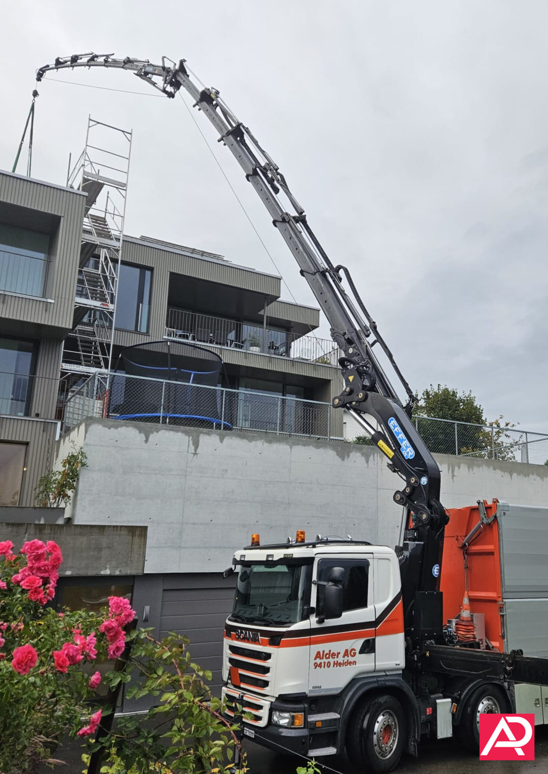 Die integrierte Krananlage ermöglicht das präzise Heben, Versetzen und Absetzen von Materialien – auch an schwer zugänglichen Stellen. Die grosszügige Mulde eignet sich optimal für den Abtransport von Aushub, Rückbaumaterialien oder sperrigem Abfall.