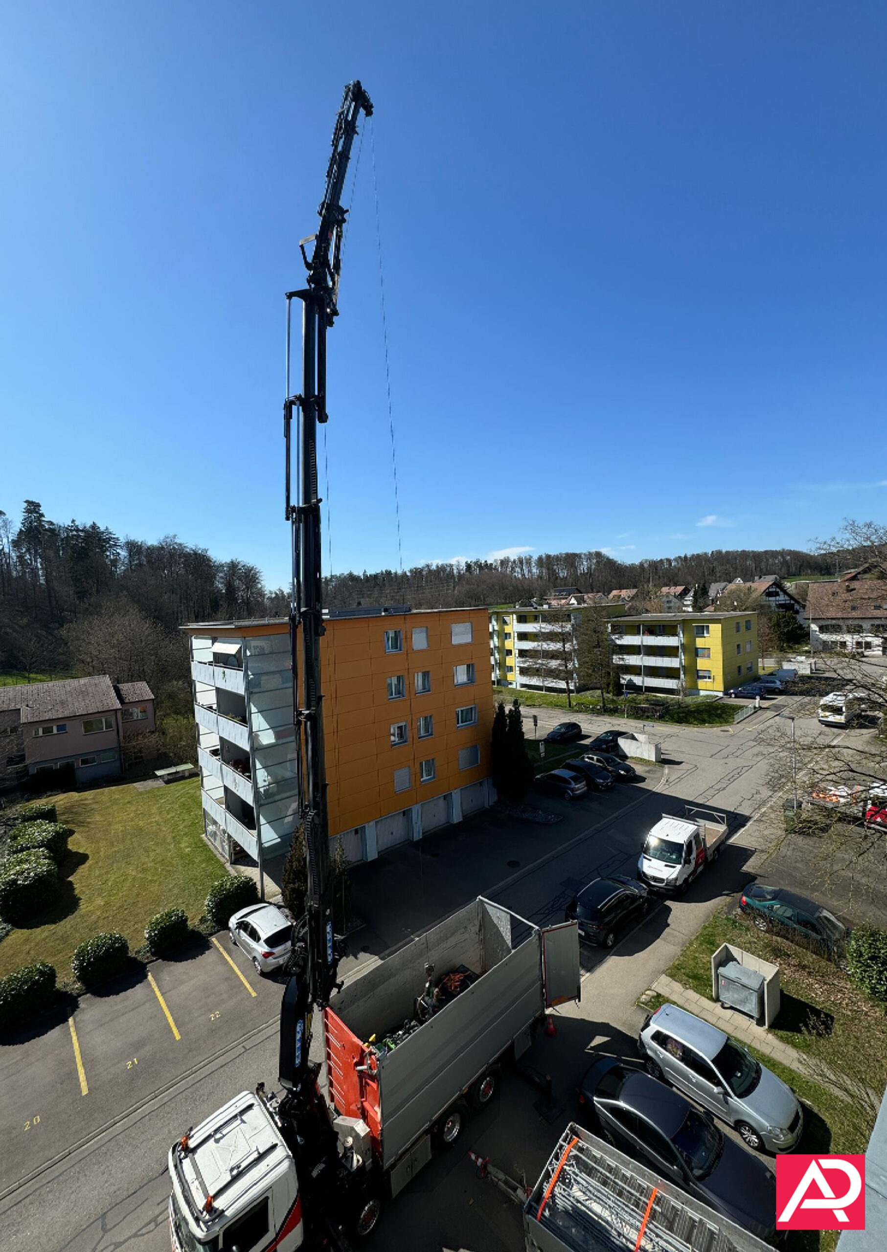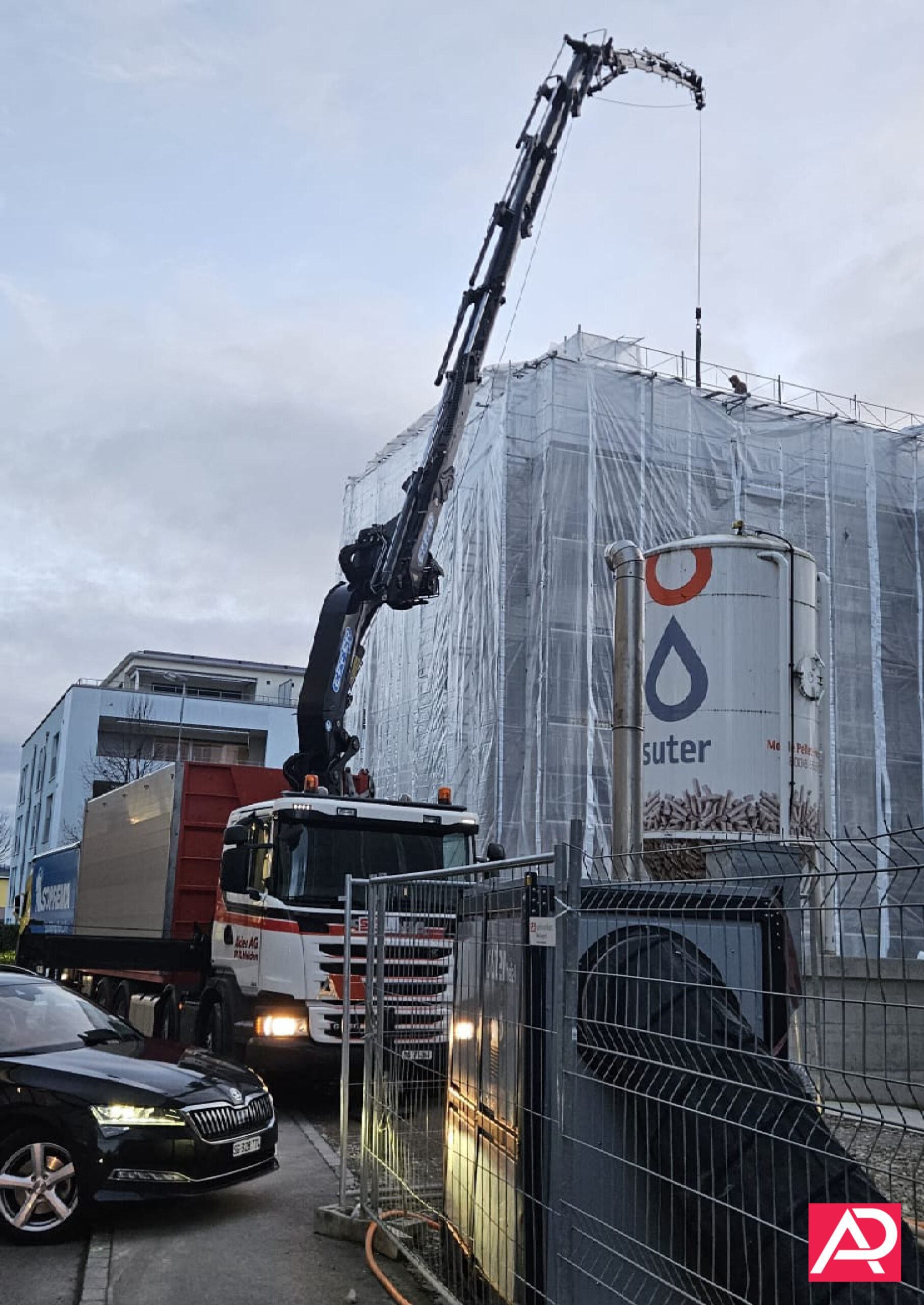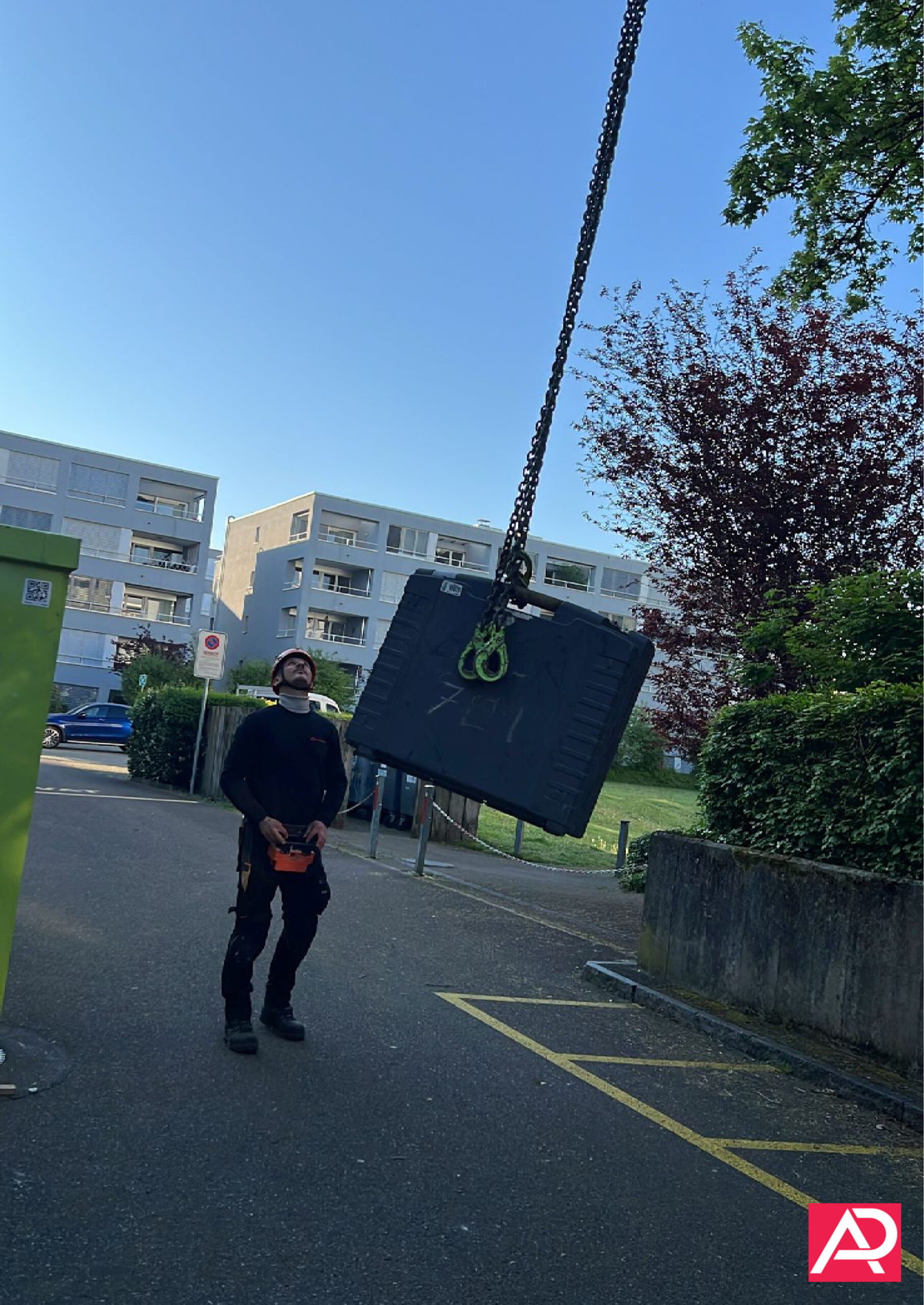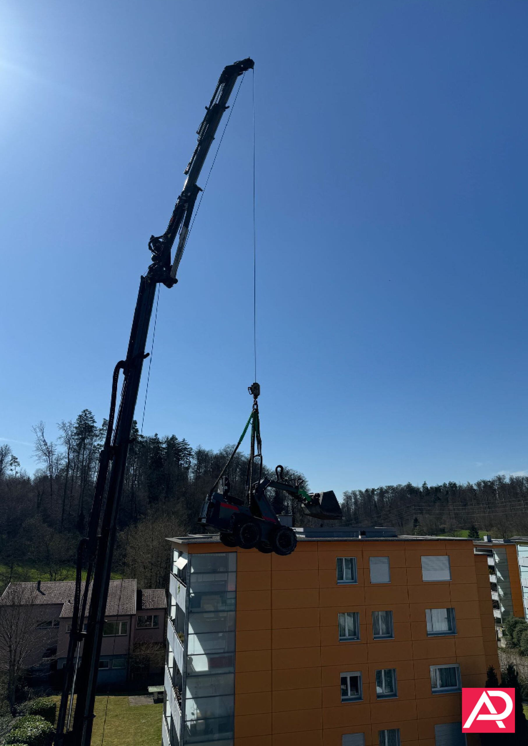 Die integrierte Krananlage ermöglicht das präzise Heben, Versetzen und Absetzen von Materialien – auch an schwer zugänglichen Stellen. Die grosszügige Mulde eignet sich optimal für den Abtransport von Aushub, Rückbaumaterialien oder sperrigem Abfall.